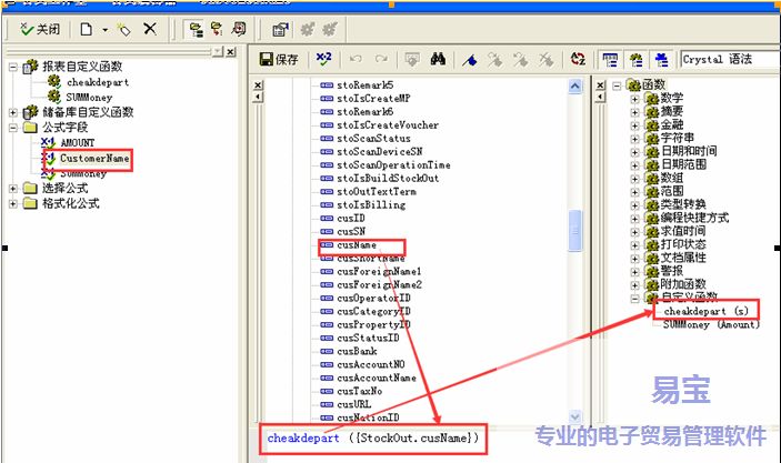 (3)在公式字段customerName编辑器里,输入cheakdepart({StockOut.cusName})