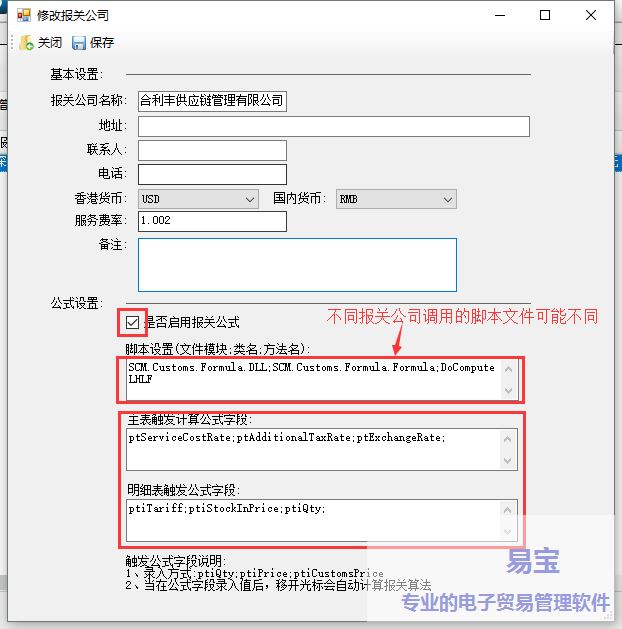 - 脚本设置:SCM.Customs.Formula.DLL;SCM.Customs.Formula.Formula;DoComputeLHLF(不同报关公司可能脚本不同,可向开发人员确认)