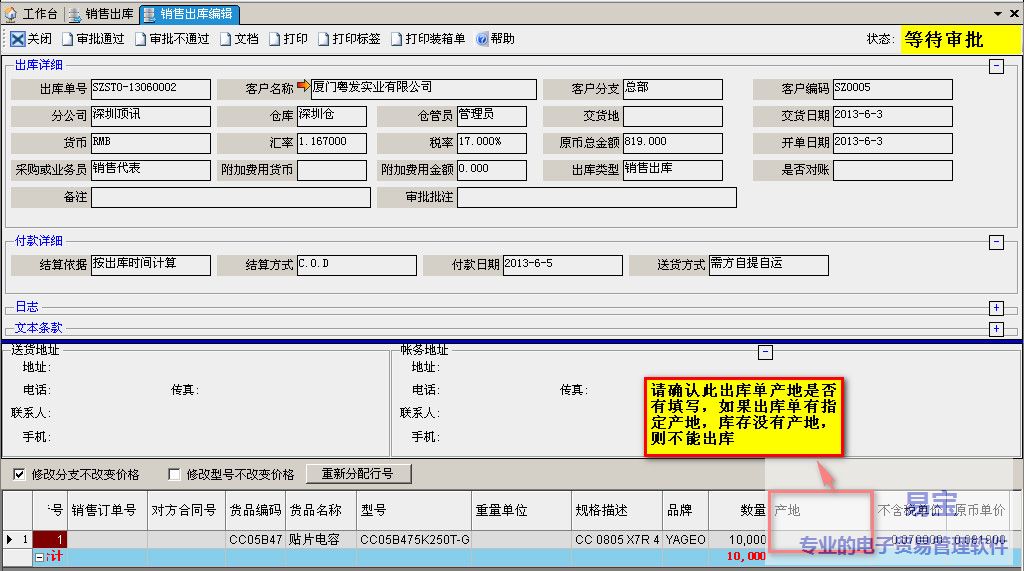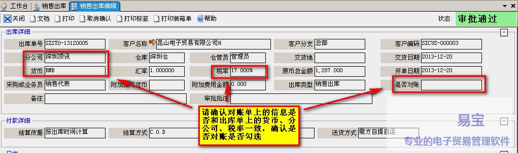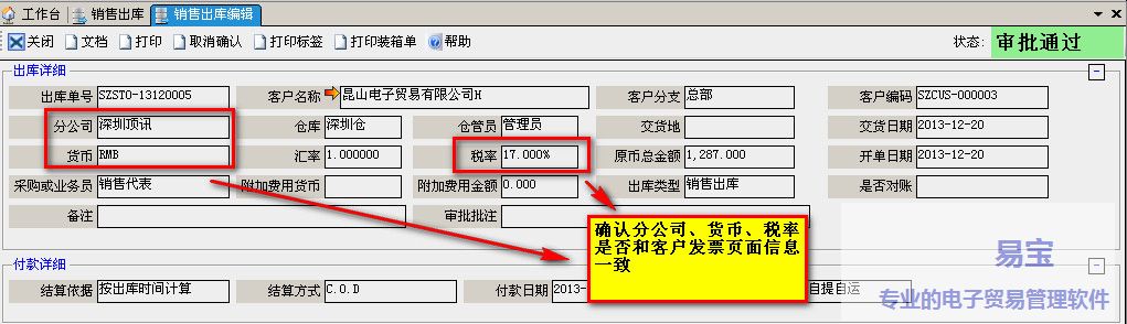 b.出库单上税率、币种、分公司是否和客户发票一致