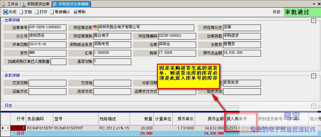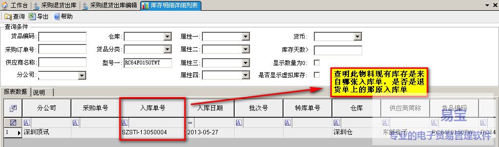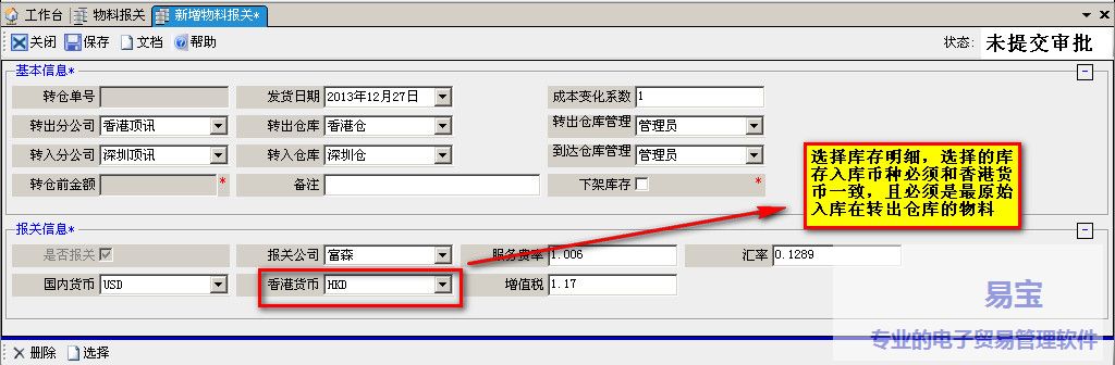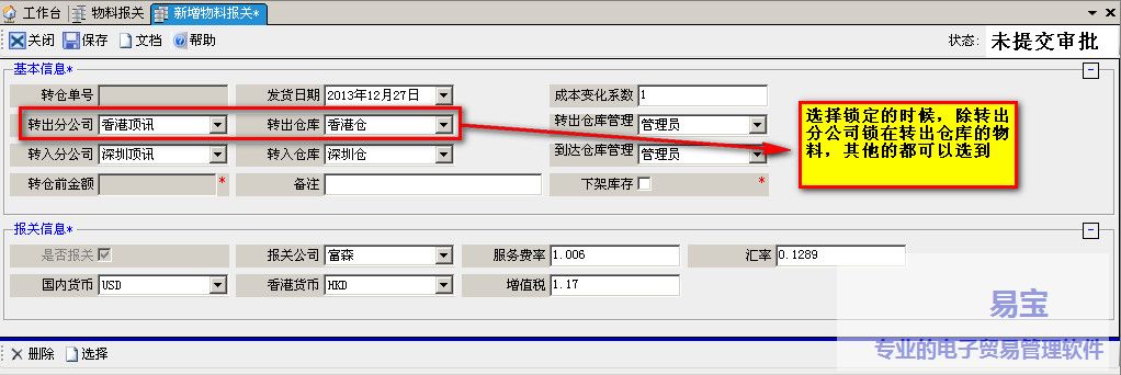 b.选择入库明细时候,要和香港币别一致且要最原始入库在转出仓库的非锁物料。