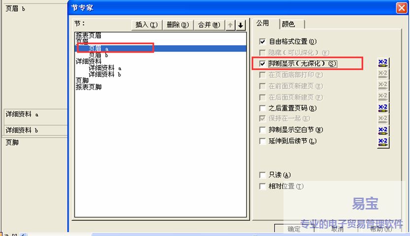(3)右击页眉下空白出-节专家-页面a和详细资料b都勾上抑制显示(无深化)