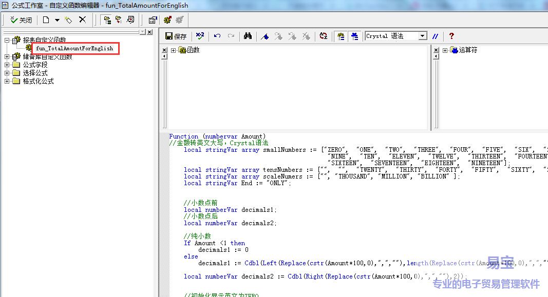 在水晶报表,公式工作室中新建报表自定义函数,函数内容如下: