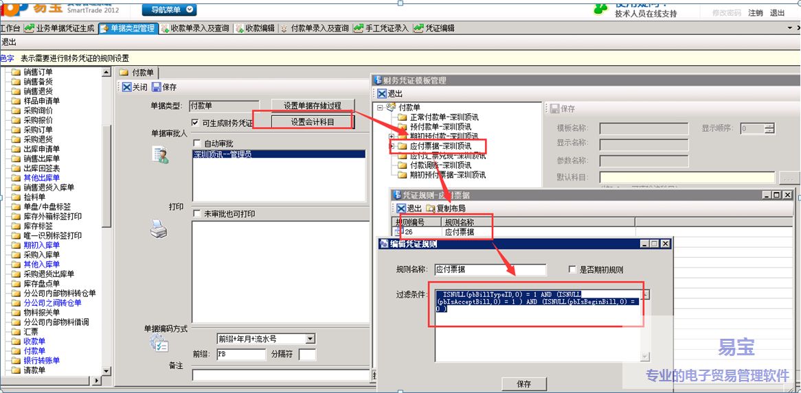 1、修改凭证规则:单据类型管理-付款单-设置会计科目-应付票据-右键-凭证生成规则:ISNULL(pbBillTypeID,0) = 1 AND (ISNULL(pbIsAcceptBill,0) = 1 ) AND (ISNULL(pbIsBeginBill,0) = 0 )
