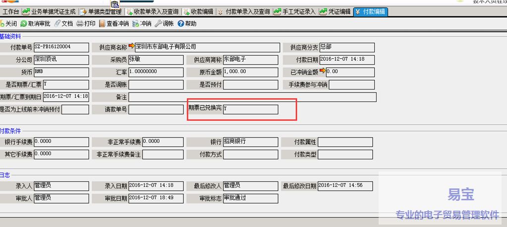 4、付款单页面,把“期票已兑换完毕”显示到页面,若是应收票据转应付票据的情况,这个付款单需要勾选“期票已兑换完毕”