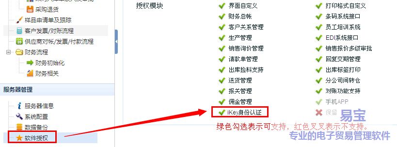 1、在系统“工作台—服务器管理—软件授权”中确认是否有“Ikey身份认证”功能,如没有,则需额外升级方可使用。