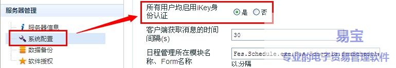 在系统“工作台—服务器配置—系统配置”中将“所有用户均启用Ikey身份认证”的选项设置为“是”。