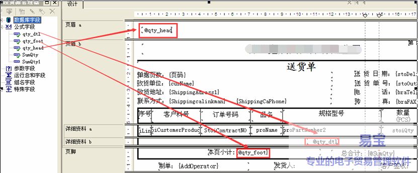 (2)添加页眉b和详细资料b(右击页眉下空白出-节专家-选择页眉-插入),把qty_dtl: 拖放到详细资料b里,qty_foot拖放到页脚里,qty_head拖放到页眉a里