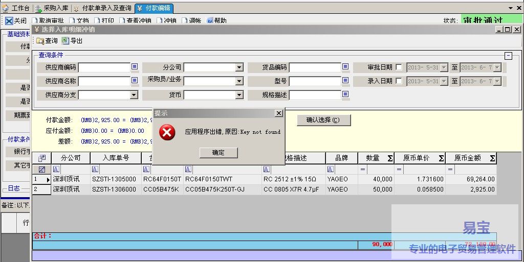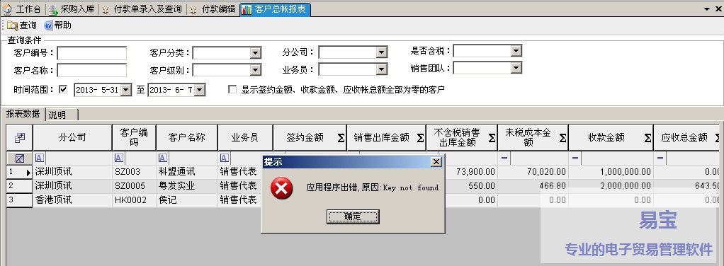 问题二:报表(总账报表和利润报表)查询提示“应用程序出错,原因:key not found”,如图: